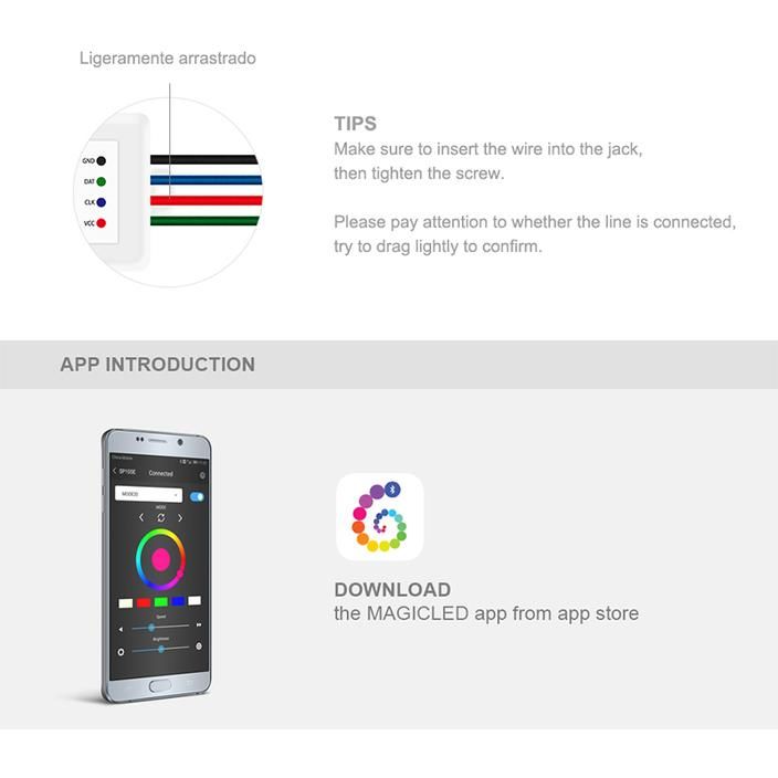 Ohjain tukee vain älykkään IC: n kaltaisia LED-valoja kuten WS2812B, WS2811, SK6812. Se ei tue tavallista RGB / RGBW-LED-nauhaa ilman älykästä IC: tä.